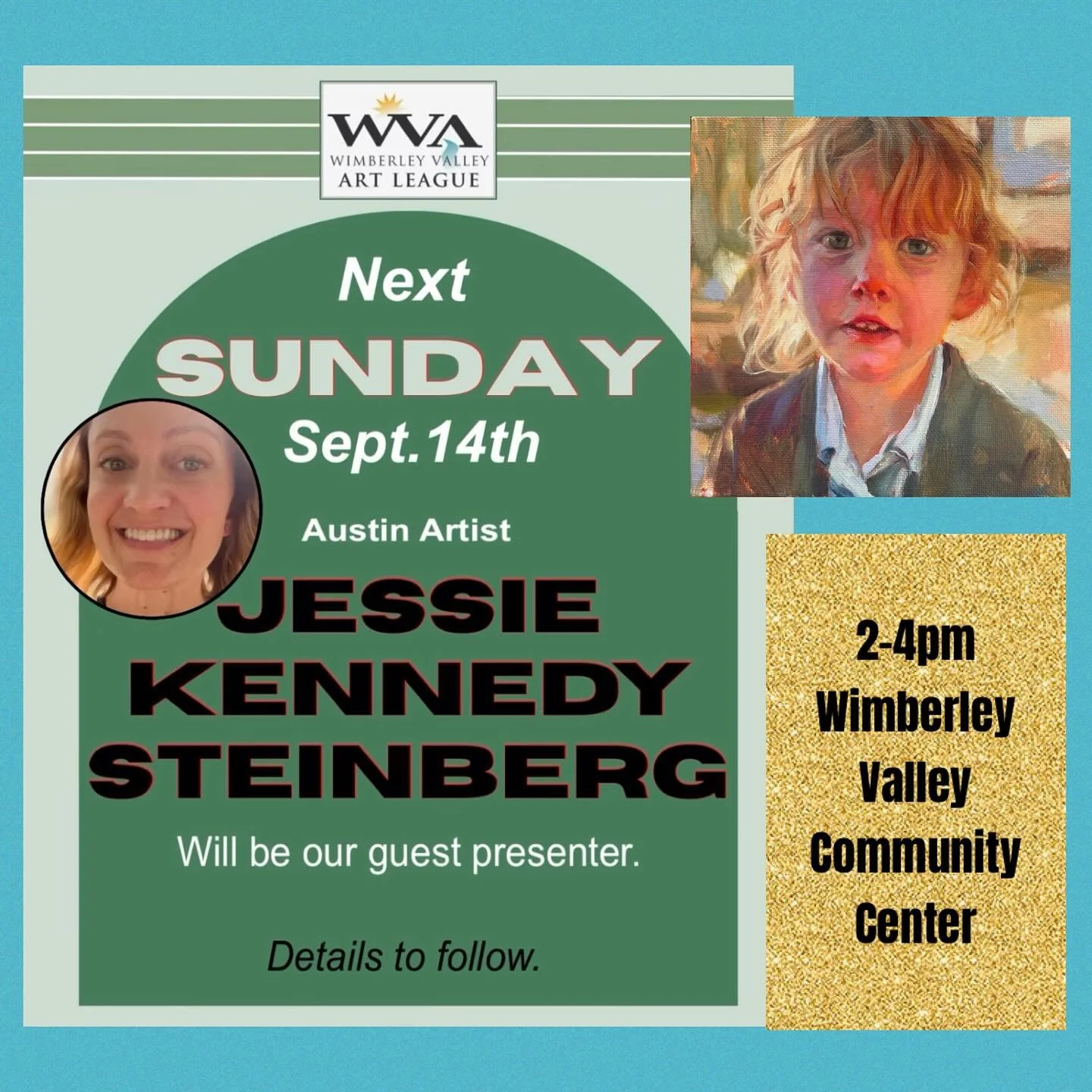 View fullsize 🎨✨ Excited to share my love of oil painting with the Wimberley Valley Art League!  I’ll be presenting my portrait painting process, inspiration, and favorite techniques next Sunday, Sept. 14th, from 2–4pm at the Wimberley Valley Communit