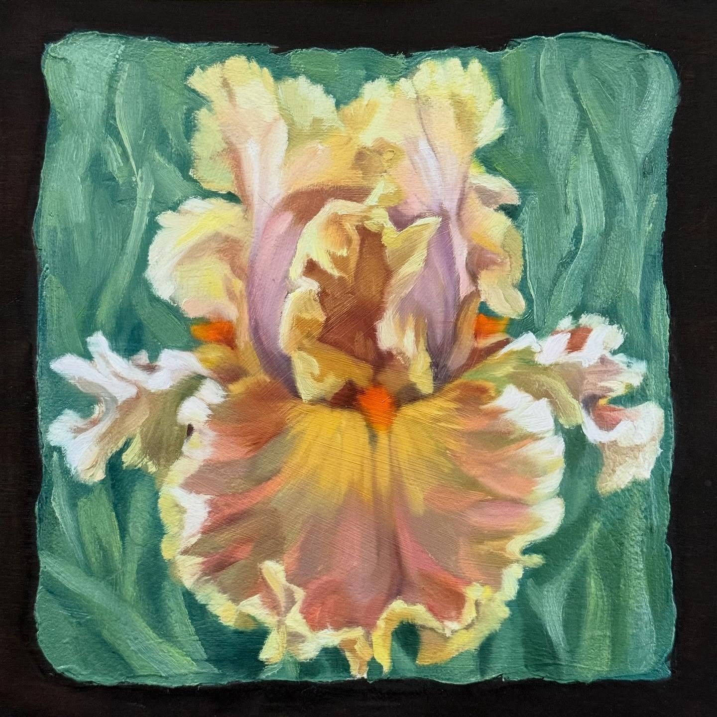 View fullsize Honeylight — an 8”x8” oil on dark Kona–stained wood with a textured fiber paste ground. Swipe to see how this golden iris unfolded over time. It’s on its way to @beecavearts for their Holiday Market later this week! More
